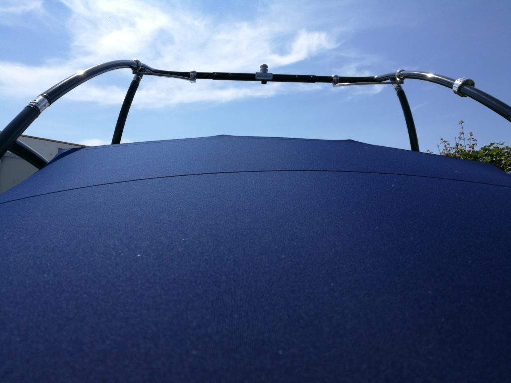 Het ultieme transport-/afdekkleed! Dit kleed dekt de hele boot af, van boeg tot en met zwemplateau en eindigt ongeveer ter hoogte van de stootlijst. Het kleed is standaard voorzien van 3 landvast openingen, zware versterkingen daar waar nodig (bijvoorbeeld raampartij). Onderlangs is het afdekkleed om de 1,5 meter voorzien van PVC driehoeken, zodat het ook onderlangs afgespannen kan worden.